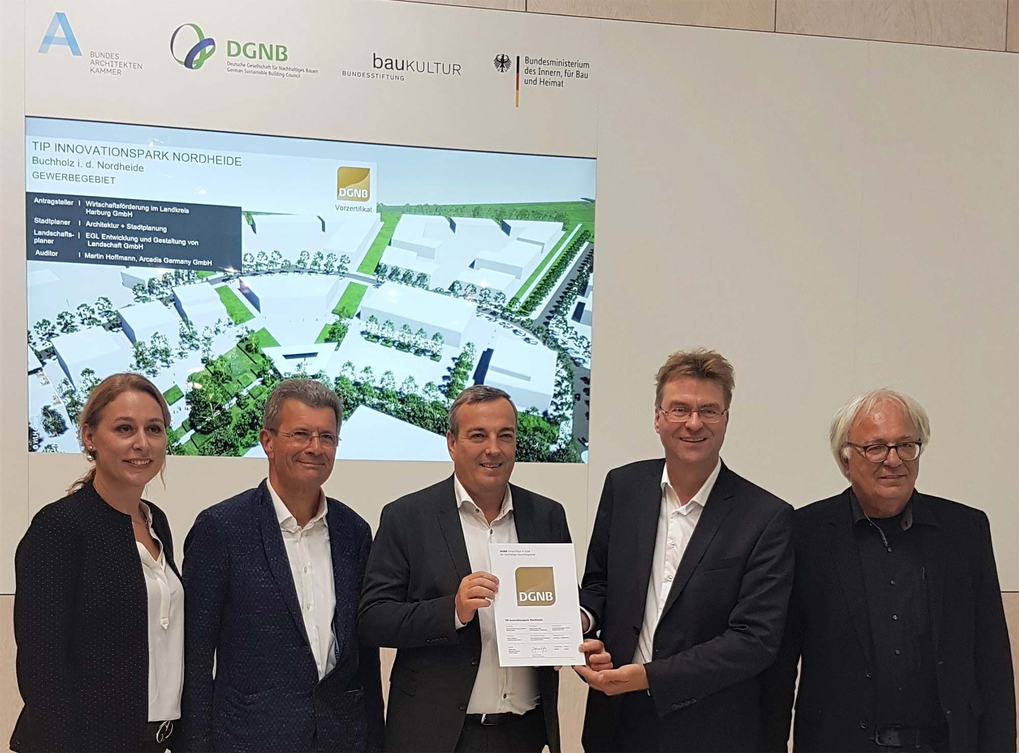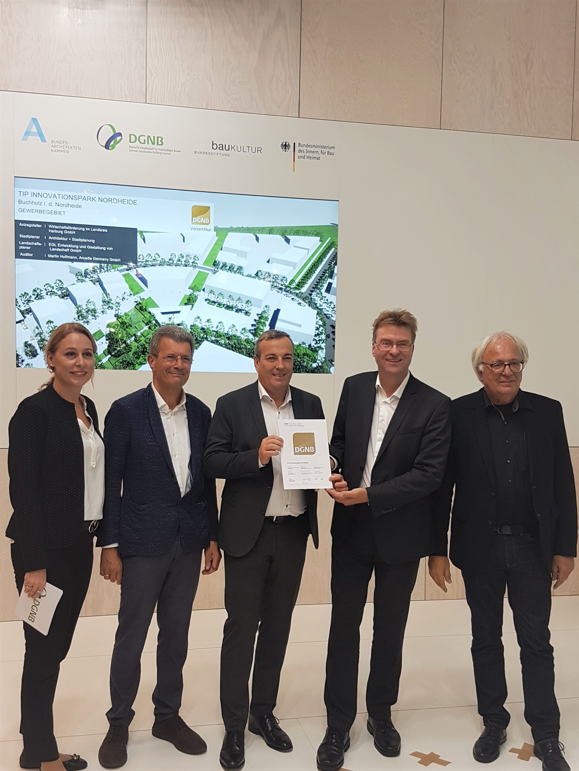 Für das DGNB-Vorzertifikat in Gold wurde das Projekt TIP Innovationspark Nordheide anhand von knapp 30 Einzelkriterien in fünf Themenfeldern geprüft. Zu den Kriterien zählen außer der ökologischen und ökonomischen Qualität beispielsweise auch Mobilität, städtebauliche Einbindung und Gestaltung sowie soziokulturelle Faktoren und Energiemanagement. Als erstes Gebiet erhält der TIP Innovationspark das Siegel nach den erweiterten „2020-Kriterien“. Neu ist die Berücksichtigung von Klimaaspekten und „smarter“ Infrastruktur. Zudem wird die Gestaltung des Umfeldes für den Menschen noch stärker in den Mittelpunkt gerückt. Im TIP werden diese Vorteile durch die Bepflanzung der Grünflächen, durch moderne Infrastruktur im Bereich Glasfaser, Sensorik und E-Mobilität sowie durch eine hohe Aufenthaltsqualität erreicht.